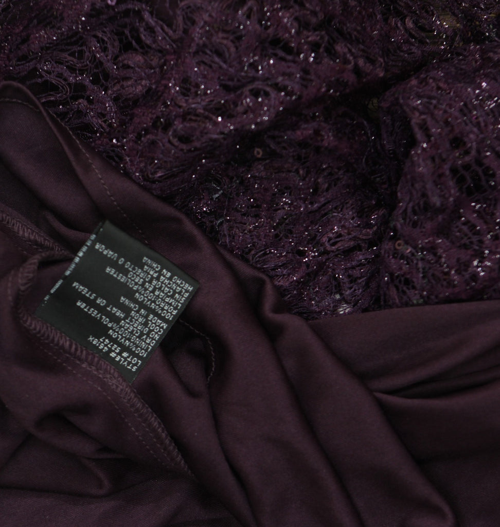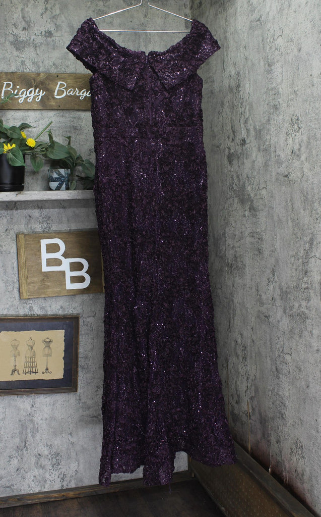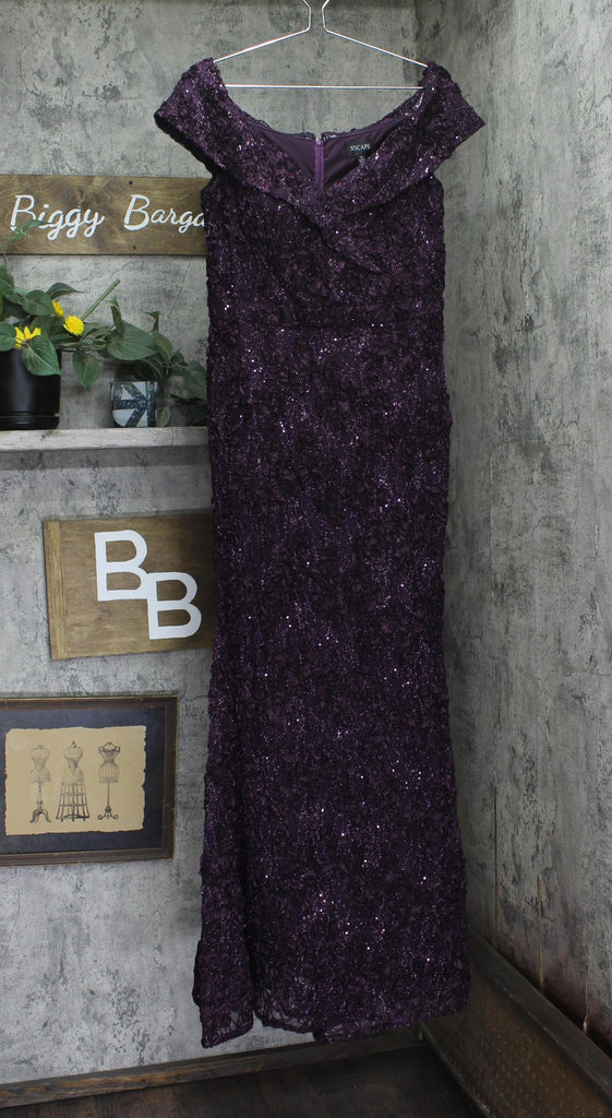Arrive to your next even and turn heads wearing the XSCAPE Long Off-the-Shoulder Lace Dress. Form fitting dress that flares out toward the hemline. Off-the-shoulder neckline. Center back zip closure. Wrap-style front bodice design.