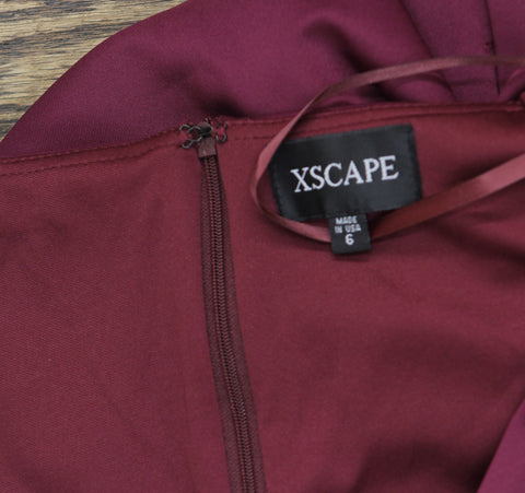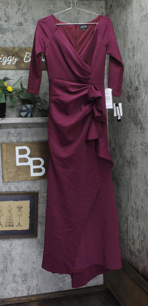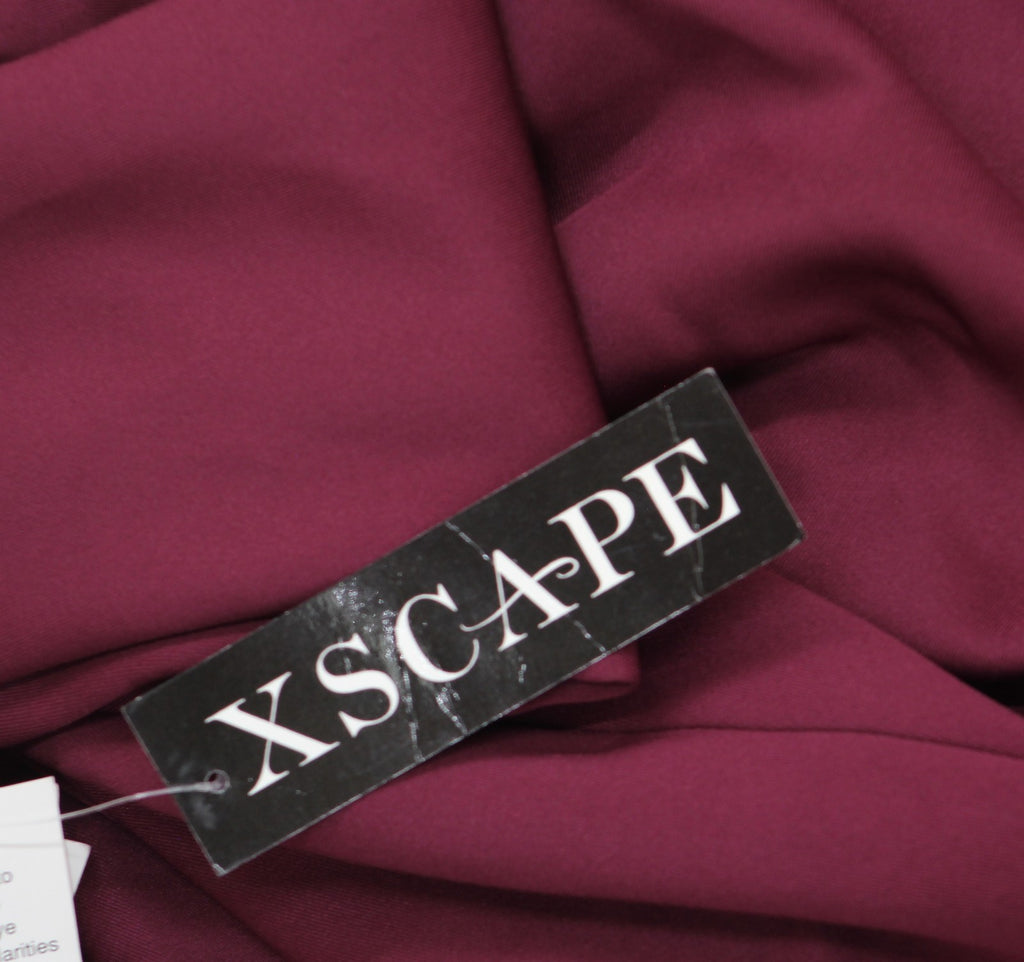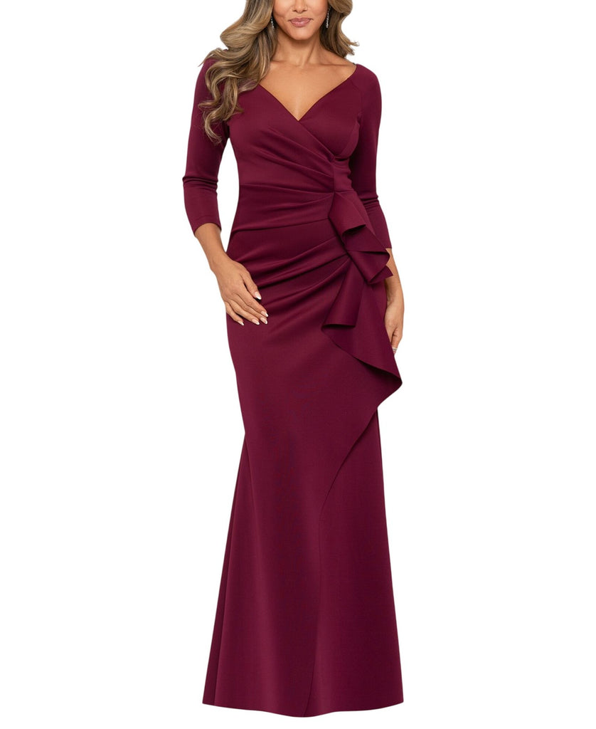 Sleek and chic with a solid-colored scuba fabrication, this stunning evening gown by Xscape hugs your curves with its A-line silhouette. Framed by three-quarter-length sleeves for a modern touch that's ideal for displaying statement bracelets, the surplice-neck design brings added dimension with pleats at the front and ruching at the back. An elegant waterfall ruffle cascades down the front for a graceful finish.